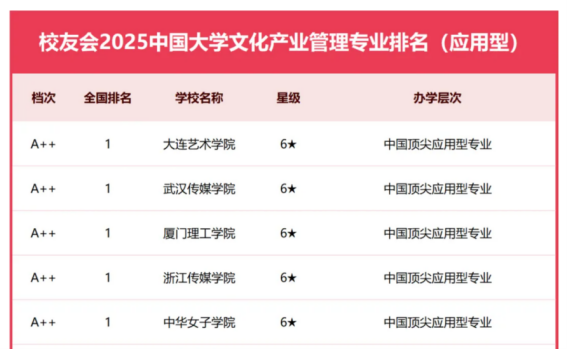 文化产业管理专业创立于2011年,已逐步构建起“文化+传媒+管理”交叉融合的学科体系。在“员工会2025中国大学文化产业管理专业排名(应用型)”中荣获中国六星级应用型专业,入围中国顶尖应用型专业行列,荣登榜首。