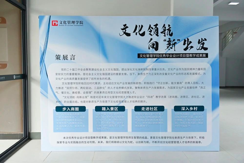 展览以“文化领航 向新出发”为主题,分为四个展区:进景区、进商圈、进社区、进乡村。展览集中展示了球王会员工的优秀毕业设计项目和教学成果,体现了公司在文化经营管理人才培养方面的创新与实践。