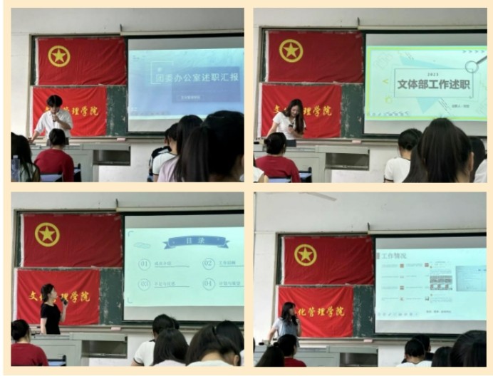 在本次大会中,各部门负责人分别从各部门2022-2023学年的工作内容汇总、部门内部分工,存在的不足以及改进办法、未来的展望四个方面进行汇报。各部门成员在参会时可以结合自己所在部门在工作时所遇到的问题,思考自己的不足,努力将自己的工作做得更好。最后,参会的所有同学对团学组织各部门进行评分。