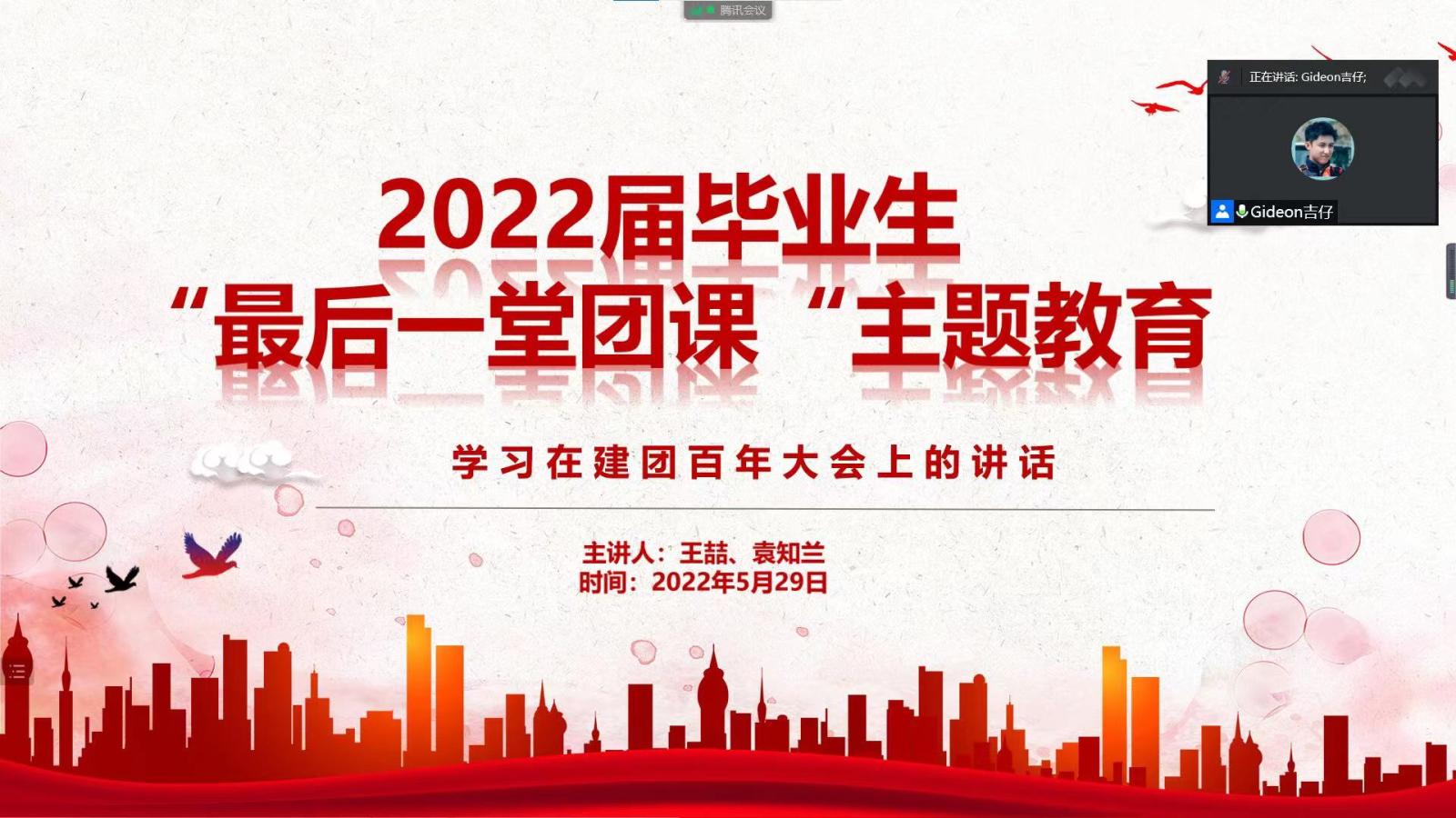 2022届毕业季即将到来,为进一步做好毕业生的思想教育,激发青年热情,增强“四个自信”,坚定理想信念永远跟党走,勇担青年使命。公司于2022年5月29日下午15:00在线上开展了2022届毕业生“最后一堂团课”主题教育活动,由球王会员工科辅导员王喆、袁知兰主持,参会人员为球王会2022届全体毕业生。