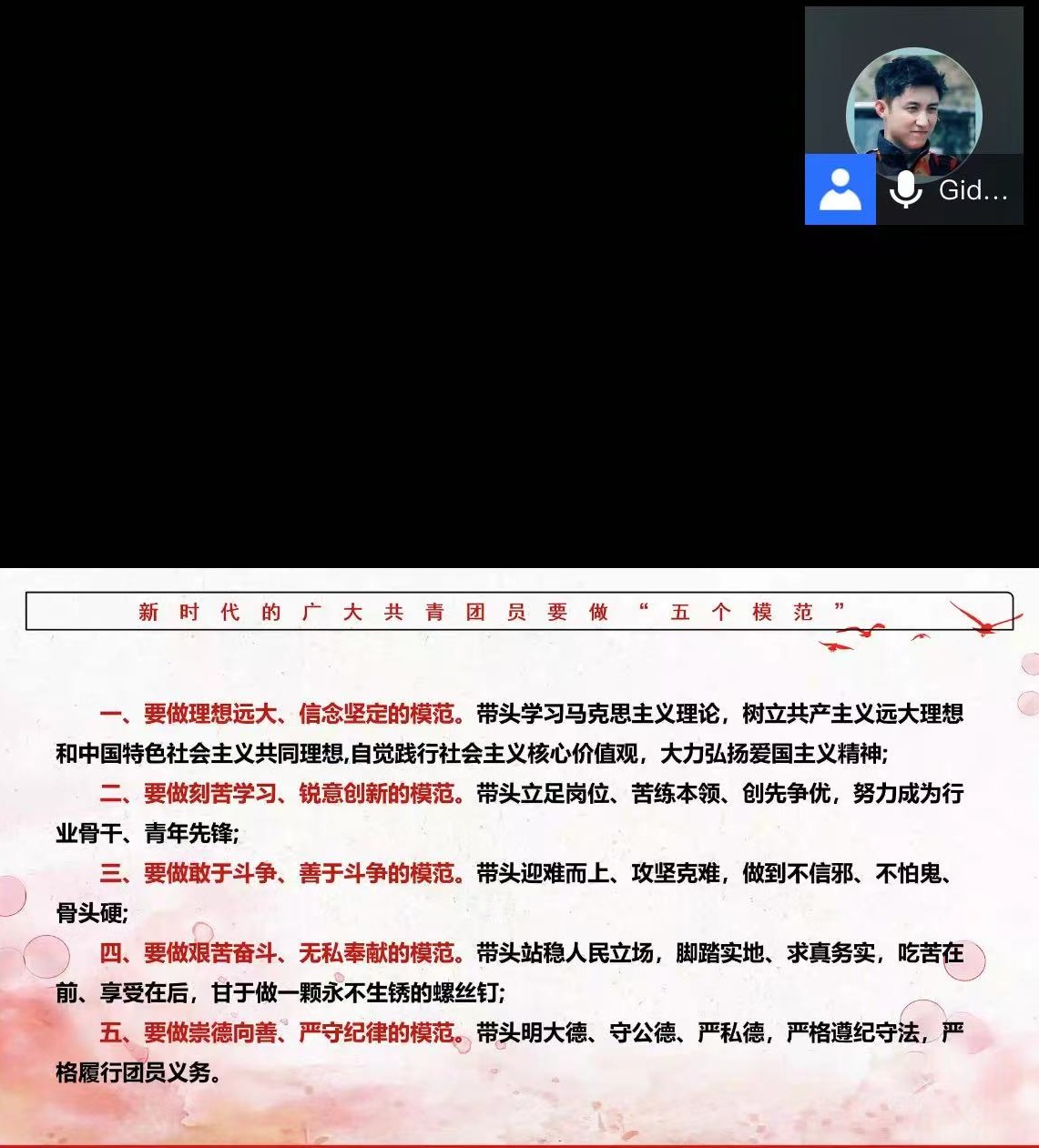 时代不同,使命不同。王喆老师和同学们一起学习了习近平总书记个共青团提出的四点希望:一、坚持为党育人,始终成为引领中国青年思想进步的政治公司。二、自觉担当尽责,始终成为组织中国青年永久奋斗的先锋力量。三、心系广大青年,始终成为党联系青年最为牢固的桥梁纽带。四、勇于自我革命,始终成为紧跟党走在时代前列的先进组织。并重点强调了新时代的广大青年团员要做到“五个模范”:一、要做理想远大、信念坚定的模范。二、要做刻苦学习、锐意创新的模范。三、要做敢于斗争、善于斗争的模范。四、要做艰苦奋斗、无私奉献的模范。五、要做崇德向善、严守纪律的模范。