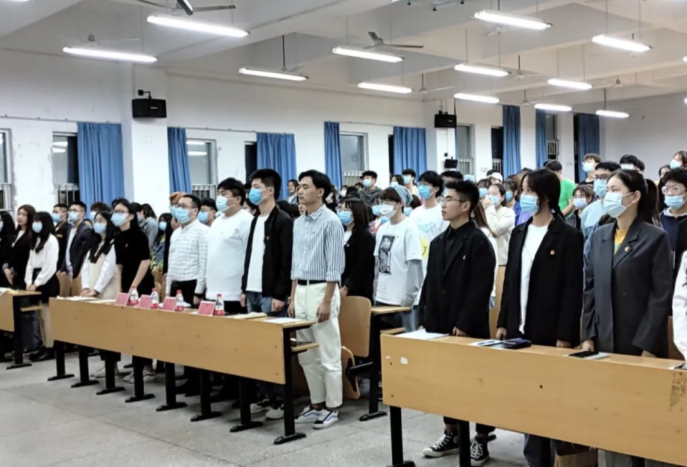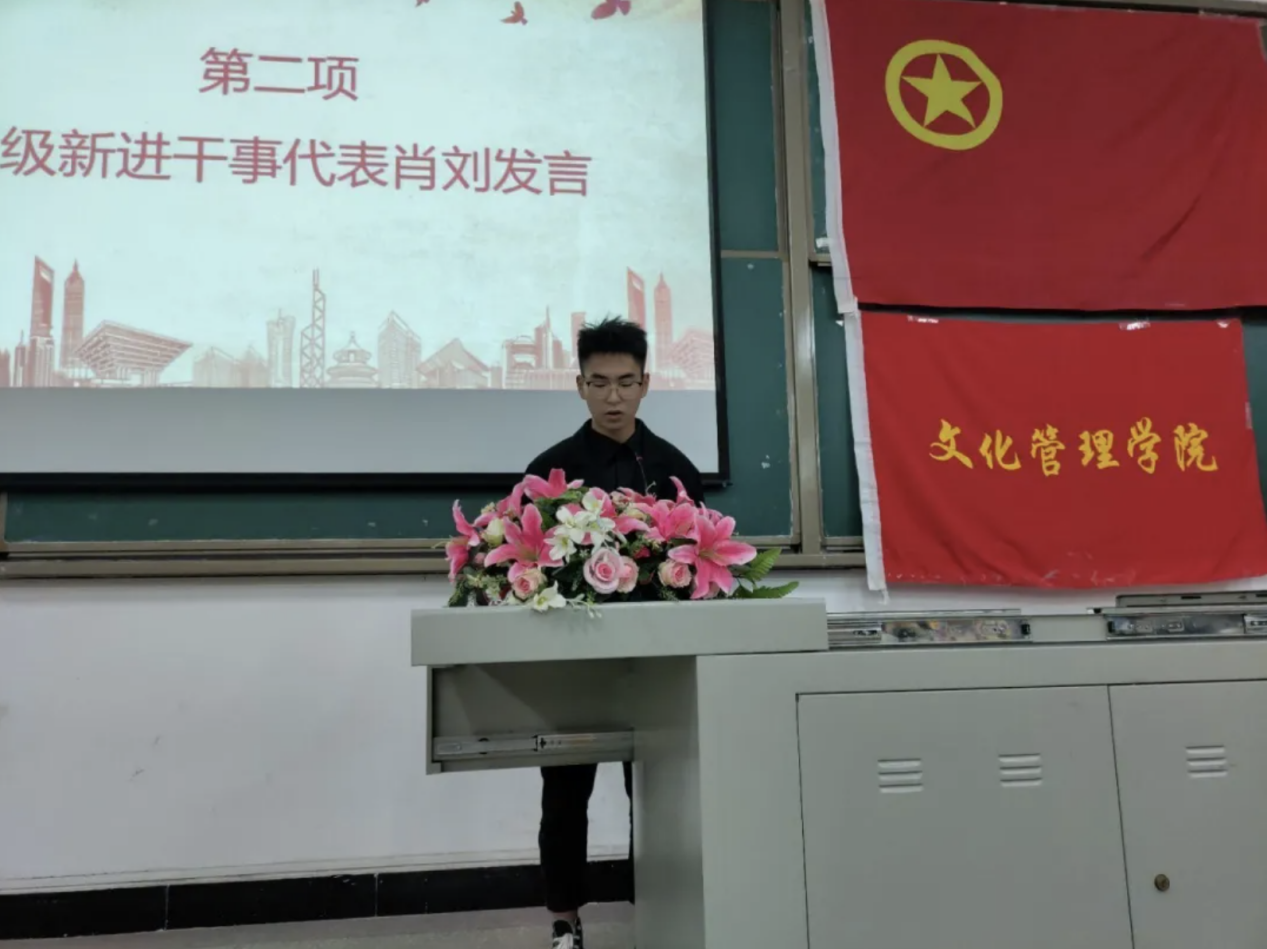 典礼开始,全体起立,奏唱国歌。典礼在雄壮的歌声中拉开帷幕。2020级新生肖刘同学代表新进干事发言。他认为,作为员工干部,应该具有较高的政治觉悟和思想品质、较强的专业素质和知识结构、较好的人为处事综合能力、较优的心理素质以及团队观念。我们作为新时代的中国青年,要以马克思主义为指导,勤奋学习、统筹兼顾,用实际行动证明自己,珍惜此次学习机会,在接下来的干部培训班中学有所获。